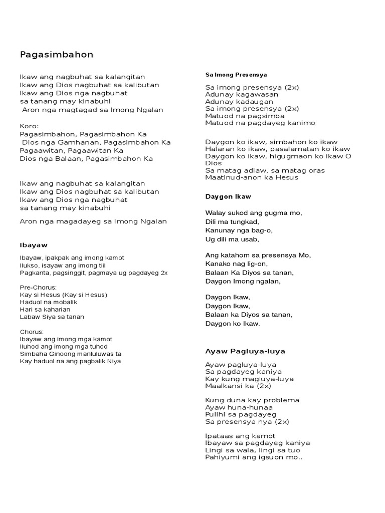 Malipayong mosimba Kanimo Walay Sama Nimo Di gyud. Oh Diyos Dalaygon Ka sa tanang panahon Matinumanon Ka sa walay katapusan Oh Dios Dalaygon Ka mahigugmaon Ka Pagasimbahon Ka sa tanang may kinabuhi Chorus. 47 Kay sa ingon niini gisugo kami sa Ginoo nga nag-ingon.